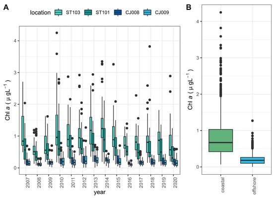Chlorophyll a concentration during the study period ranged from 0.00 to 4.25 µgL−1 in the dataset. The coastal stations showed significantly higher values, ranging from 0.07 to 4.25 µgL−1, than the offshore stations with a range of 0.00–1.27 µgL−1 (Wilcoxon rank sum test with continuity correction, p-value ≤ 2.2 × 10−16) (Figure 11A,B). We did not observe any particular trend at either coastal or offshore stations (Figure 11A).
