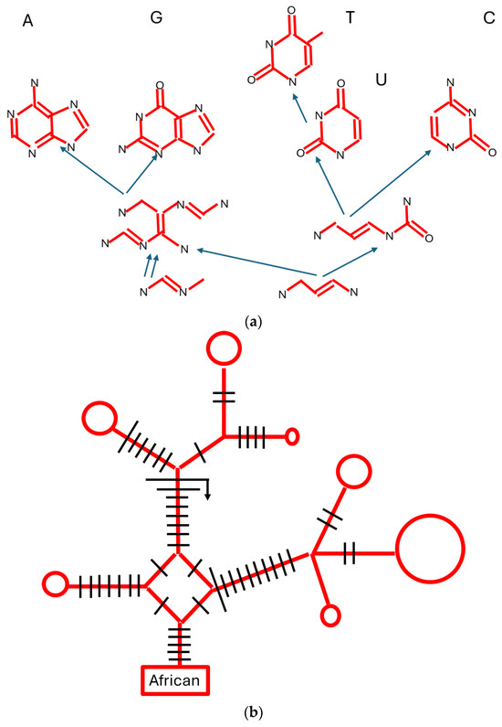 Assembly trees, non-biological and biological. (a) A non-biological partial molecular assembly tree for synthesis of the nucleic acid bases; purines A and G; and pyrimidines T, U, and C. The letters N and O denote oxygen and nitrogen, and vertices without a letter are carbons (redrafted from [36]). (b) A biological phylogenetic network of Finnish human mitochondrial DNA sequences, originating from African ‘root’. Size of circles is proportional to the number of identical sequences at that node. Bars indicate base alterations that are all transition substitutions (pyrimidine for pyrimidine, T↔C or purine for purine A↔G), except for the intermediate-length bars, which are the more chemically difficult transversions (purine to pyrimidine, or vice versa). The very long bar with an arrow indicates a back mutation to a state present earlier in the phylogeny. Notice the diamond shape in the centre of the network that shows alternative substitution pathways in the origin of the sequences above it. This is a partial redraft of the network in [37].