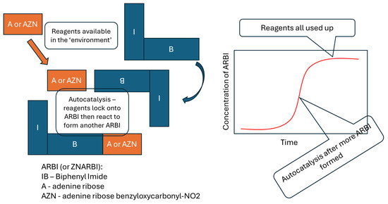 An autocatalytic reaction. Similar reactions happen for adenine ribose biphenyl imide (ARBI) or benzyloxycarbonyl-NO2 adenine ribose biphenyl imide (ZNARBI). If the environment includes radiation, then ZNARBI is mutated to ARBI, and ARBI replicates faster than ZNARBI, so ARBI outcompetes or is more ‘adapted’ to that environment. Simplified from [45].