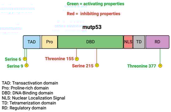 Phosphorylation can strongly influence wtp53 activity, as this protein is phosphorylatable at multiple serine and threonine residues. Several kinases, including homeodomain interacting protein kinase 2 (HipK2), p38 MAP kinase, checkpoint kinase 1 (CHK1,) and c-Jun N-terminal kinase (JNK) [29], are able to phosphorylate wtp53. This process finely regulates the transcription of the different targets from the pro-survival ones, such as in the case of serine 15 phosphorylation, which mainly promotes p21 transcription and induces cell cycle arrest, to serine 46 phosphorylation, which triggers apoptosis [30]. Other than wtp53, phosphorylation may affect mutp53, and PTM also influences its function depending on the residues that undergo phosphorylation and the cellular context in which the phosphorylation occurs. It has been reported, for example, that mutp53 phosphorylation on serine 6, serine 9, and threonine 377 positively influences its GOF. Conversely, phosphorylation on threonine 155 and serine 215 may negatively affect mutp53 expression level and reduce its oncogenic activities [31,32] (Figure 2). These data suggest that strategies able to activate or inhibit kinases that affect mutp53 phosphorylation at the different sites may have a strong impact on the activity of these oncogenic proteins.