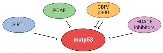 Interestingly, other than wtp53, p300 has been reported to contribute to the stabilization of its negative regulator MDM2, thereby enhancing the p53/MDM2 negative regulatory loop [43]. Other authors have shown that CBP/p300 promotes wt- and mutp53 acetylation, activating wtp53 and restoring the wtp53 function in mutp53-carrying prostate cancer cells [44]. Similarly, the acetyltransferase PCAF can mediate the acetylation of mutp53 and reactivate the wtp53 functions [45].