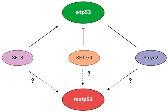 Protein methylation is mediated by enzymes that add from one to three methyl groups on particular substrates, the lysine ε-amino group of histone or non-histone proteins. By accepting different numbers of methyl groups, the proteins may undergo mono-, di-, or trimethylation (me1, me2, or me3), resulting in a different outcome on gene transcription [49]. On the other hand, enzymes that remove methyl groups oppositely influence this PTM. Several transcription factors can undergo methylation/demethylation at different lysine sites and to different degrees. Among them, wtp53 may be decorated by lysine methylation at multiple sites, which regulates its activity. For example, mono-methylation of p53 at lysine 372 (p53K372me1), which is mediated by the SET domain-containing lysine methyltransferase 7 (also called Set9 or SET7/9) and takes place in the nucleus, positively affects p53 stability as well as the expression of p53 target genes [50]. Interestingly, SET7/9 stabilizes chromatin-bound wtp53 by positively influencing its acetylation [51]. Furthermore, SET7/9 has been shown to abrogate the de-acetylating activity of SIRT1 on wtp53 [52]. Differently from SET7/9, mono-methylation of wtp53 at lysine 370 (p53K370me1), mediated by the lysine methyltransferase SET and MYND domain-containing protein 2 (Smyd2), results in the repression of its transactivating activity [53].