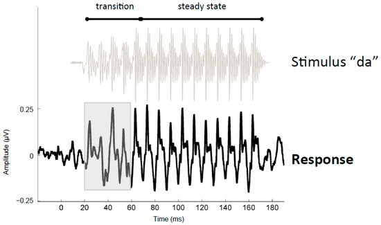 For each participant, FFRs were recorded to a 170 ms synthesized speech syllable “da”, containing an initial 50 ms formant transition followed by a 120 ms period with stable formants (Figure 1). The stimulus was played to the right ear through insert earphones (Etymōtic Laboratories) at 80 dB SPL with a signal-to-noise ratio (SNR) of +10 dB relative to 6-talker English babble that looped in the background. A quiet condition (with no background noise) was also included in the study design, but it was not included here; our previous findings suggested that the effect of training was nominal for the quiet condition and more evident for the background noise condition. FFRs were differentially recorded using a vertical montage from Cz (active), right earlobe (reference), and forehead (ground) at a 20 kHz sampling rate in Neuroscan Acquire (Compumedics USA, Charlotte, NC, USA). Stimuli were presented in alternating polarity at a rate of 4.3/s. Filtering was performed offline using Neuroscan Edit from 70 to 2000 Hz (Butterworth filter, 12 dB/octave). Responses were epoched over a window spanning 40 ms before and 190 ms after the onset of the stimulus. After excluding trials containing myogenic artifacts, 3000 artifact-free responses to each stimulus polarity were averaged and responses to alternating polarities were averaged to produce the final response. The process of averaging responses to alternating polarities helps to eliminate stimulus artifacts and the cochlear microphonic [31,32]. Myogenic artifacts were defined as trials with activity exceeding ±35 µV.