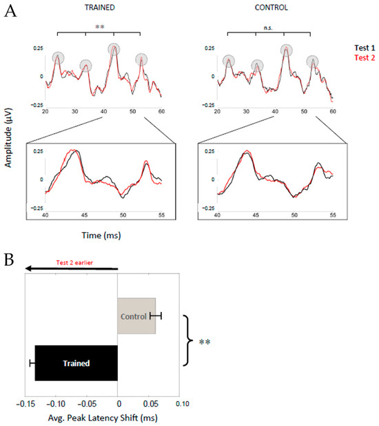 After auditory training, peak latencies are earlier in the neural response to the formant transition. (A) The speech-evoked frequency-following response (FFR) includes four prominent positive peaks during the formant transition period at ~24, 34, 44, and 54 ms. The group average time-domain waveforms are plotted for test1 (black) and test2 (red) for the Trained (left) and Control Groups (right), with the four prominent peaks encircled. To visualize changes in peak timing more clearly, the waveforms are zoomed in to highlight the 40–55 ms window to show the third and fourth major peak in the transition. (B) The average peak latency shift is plotted for the Trained (black) and Control (gray) Groups, with error bars representing ±1 standard error of the mean of the four transition peaks. The response was earlier at test2 in the Trained Group (black) but not the Control Group (gray) (main effect of group: F(1,53) = 9.346, p = 0.003). Note that (1) group average waveforms can visually blur latency shifts at the major peaks when participants entered the waveform have different baseline latencies and (2) that phase shifts are visually evident not just at the major peaks but also between the major peaks. **, p < 0.01.