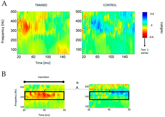 For analysis purposes, the cross-phaseogram was binned by time and frequency. For each participant, test1-to-test2 phase shifts were averaged over a low frequency (80–220 Hz) and a higher frequency (280–420 Hz) range for the formant transition and steady-state vowel periods. The lower range was selected because for this dataset Song et al., 2012 [12] reported that the spectral power of the FFR was more intense in the 80–220 Hz range after training compared to before, with no changes found for the higher frequency range across test sessions. The 280–420 Hz window was selected because this is where the most prominent phase shifts appear in the Training Group cross-phaseogram (Figure 3), and neural delays that emerge in background noise are greatest near this frequency band [35].