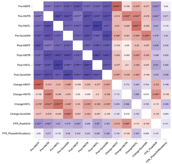 Pearson’s r-heatmap for the Trained Group showing the relationships between performance on the speech perception in noise tests (HINT-F, HINT-R, HINT-L, QuickSIN) between pre- and post-training. Relationships between the change in behavioral performance and change in FFR peak latency and phase are also presented. Positive r-values are coded in blue, and negative r-values are coded in red, with the color gradient reflecting the strength of the correlation. The strongest behavioral performers at pre-test remained the strongest at post-test and showed the smallest behavioral changes but the biggest physiological changes. * p < 0.05, ** p < 0.01, *** p < 0.001.