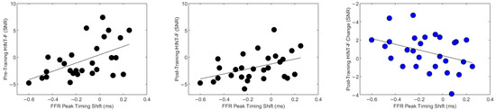 Brain-behavioral relationships. (left) Better performance on the Hearing in Noise Test (HINT-F) before training (lower value) was associated with bigger training-related changes in neurophysiology, such that the earlier (lower value) the frequency-following response peaks shifted with training, the better the speech recognition threshold was before training. (middle) Similarly, better performance on the Hearing in Noise Test (HINT-F) after training (lower value) was associated with bigger training-related changes in neurophysiology (lower value), such that the earlier the frequency-following response peaks shifted with training, the better the speech recognition threshold was after training. The y-axis shows the HINT score, which represents the dB SNR at which 50% of the sentences were repeated correctly. For HINT, negative scores indicate better performance. (right) Smaller behavioral changes with training were associated with bigger training-related changes in neurophysiology. Refer to Figure 5 for r and p-values.