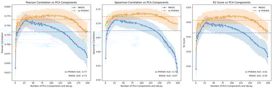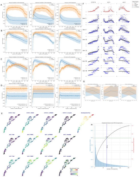 We performed an additional analysis, as shown in Figure 2B, which showed that sc-PHENIX with PCA-UMAP initialization is more robust against PCA dimensionality than MAGIC regarding recovering gene expression. The imputation performance of sc-PHENIX is higher when using PCA, whereas with MAGIC, its performance decreases with higher PCA dimensions. This indicates that sc-PHENIX deals much better with the detrimental effects of the curse of dimensionality generated using more PCA dimensions. Therefore, PCA components with small variances should not be underrated and discarded. The accumulation of these smallest eigenvalues can render better results to the imputation performance in combination with UMAP in the pipeline of sc-PHENIX. Additionally, we attempted to use only UMAP initialization (without PCA) for the corrupted bulk data (Figure 2D), and the imputation performance was worse than PCA-UMAP initialization but better than MAGIC. However, in the PBCM data dataset (Supplementary Material: Section S4), UMAP initialization resulted in over-smoothed gene–gene interactions in general, with only PCA-UMAP initialization preserving gene–gene interactions through the use of imputation parameters. Also, Figure 2H demonstrated that caution is needed with variability capture practices, such as the rule of thumb of capturing at least 70% of the data’s variability. We observed that in the corrupted C. elegans data, using n_pca = 71 distorts the data topology and consequently over-smoothing occurs if MAGIC relies solely on this initialization. In contrast, the PCA-UMAP initialization with n_pca = 71 improved the sc-PHENIX imputation (Figure 2B). Therefore, for scRNA-seq data, PCA-UMAP initialization is necessary to preserve the data structure for sc-PHENIX imputation.