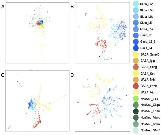 - Tasic, B.; Menon, V.; Nguyen, T.N.; Kim, T.K.; Jarsky, T.; Yao, Z.; Levi, B.; Gray, L.T.; Sorensen, S.A.; Dolbeare, T.; et al. Adult Mouse Cortical Cell Taxonomy Revealed by Single Cell Transcriptomics. Nat. Neurosci. 2016, 19, 335–346. [Google Scholar] [CrossRef]