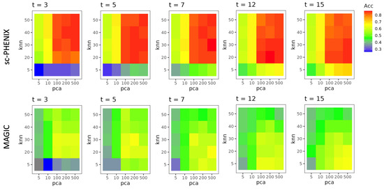 For the neuronal dataset, we created several 2D plots from the Mt of MAGIC and sc-PHENIX based on different combinations of PCA dimensions, t, and knn values. This was carried out to evaluate the performance of cluster structures. We used a knn classifier from the scikit-learn library, KNeighborsClassifier [38], with knn = 30 to assess local structure preservation. Using the cluster labels from the 2D MDS embedding, we measured the accuracy of the knn classifier in predicting these 21 phenotype labels. This approach helps determine how well the local cluster structures are preserved in the 2D projections from MAGIC and sc-PHENIX.