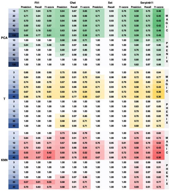 Each confusion matrix is from imputation from MAGIC and sc-PHENIX using a combination of parameters, PCA dimensions, t, and knn; we obtained precision, recall, and f1-score metrics, and more values of these metrics indicate better quality imputation, meaning a more accurate preservation of gene expression in their respective cell phenotypes. It is worth mentioning that this kind of over-smoothing evaluation needs to be included in scRNA-seq imputation benchmarking [6,20]. Benchmarking focuses on obtaining more recovered differential genes for a good imputation approach. However, the effect of over-smoothing of gene-specific markers post-imputation is not contemplated as quality control. In Supplementary Material: Methods S1, we provide a visual diagram of the imputation performance.