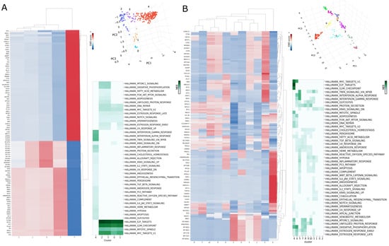Gene set enrichment analysis of clusters: We used WebGestalt (WEB-based Gene SeT AnaLysis Toolkit) to perform the enrichment, as used in other biological models and data [31,32,33,34,35]. We considered only the HALLMARKS pathways of Molecular Signatures Database (MSigDB) v7.5.1 to facilitate the analysis. The EMD score values were used with WebGestalt (http://www.webgestalt.org/), accessed on 1 June 2023 [31]; the functional database was obtained from MSigDB gene sets (http://www.gsea-msigdb.org/gsea/msigdb/collections.jsp#H, accessed on 23 February 2024) in the h.all.v7.5.1.symbols.gmt file (hallmark gene sets) and c2.cp.reactome.v2022.1.Hs.symbols.gmt file (REACTOME gene sets). WebGestalt has the freedom to use several statistical tests, is versatile within several databases and enrichment pipelines, and is user-friendly. Instead of collapsing data by the mean of gene cluster expression, we used the EMD score values.