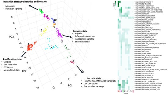 This is important to discuss because, for the imputed results obtained from the sc-PHENIX of the tumor spheroid dataset, cancer is typically considered a set of discrete phenotypic states in most reports. However, some authors support the idea that tumor cells reside within a cell-state continuum rather than in discrete subtype clusters [5,60,61]. For example, the EMT in scRNA-seq experiments can be analyzed as a continuum, where single cells follow a continuum in a low-dimensional manifold. In this manifold, the gene expression dynamics of EMT canonical markers, such as VIM and CDH1 (e-cadherin), show the epithelial or mesenchymal states. In which the upregulation of VIM and the downregulation of CDH1 indicate a mesenchymal state, and the opposite indicates an epithelial state [55]. Regarding tumor spheroids, mesenchymal cell populations normally give rise to other cells that are organized as three-dimensional masses rather than sheets [62,63]. Additionally, experimentally, hypoxia increases extracellular components involved in cellular adhesion, i.e., fibronectin (FN1) in tumor spheroids [64]. Finally, due to extracellular adhesive components, densely packed cells interfere with the oxygen supply to the tumors. This results in a gradient of oxygen concentration along with the tumor spheroid, and therefore, the presence of hypoxia inside the spheroids [65]. We can make hypotheses based on the spheroid dataset imputed by sc-PHENIX with the previous information.