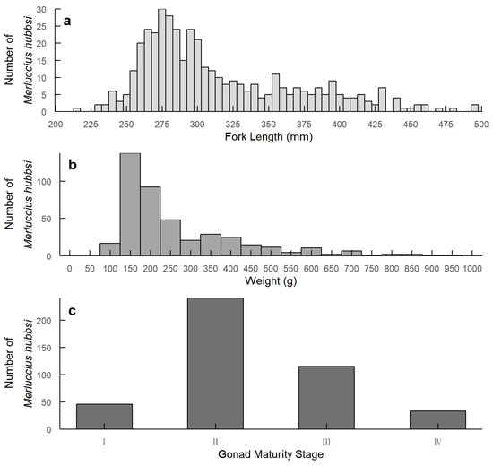 Distribution of fork length, weight, and gonad maturity stages of M. hubbsi. (a) Fork length distribution (mm); (b) Weight distribution (g); (c) Gonad maturity stage distribution.