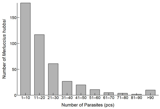 The analysis of the number of parasites infecting M. hubbsi revealed the distribution of parasite infection (Figure 3). Most of the fish samples were infected with 1 to 20 parasites, with the highest proportion of fish (44.37%) being infected with 1 to 10 parasites.