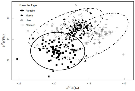 The stable isotope analysis indicated distinct δ13C and δ15N values for the parasites and various host tissues. The δ13C values of the parasites spanned from −22.10‰ to −18.51‰, with a range difference of 3.59‰, while the δ15N values ranged from 10.45‰ to 14.54‰, with a range difference of 4.09‰. For the host tissues, the δ13C values were observed as follows: muscle ranged from −19.43‰ to −17.86‰ (range difference: 1.57‰), liver from −21.49‰ to −17.32‰ (range difference: 4.17‰), and stomach from −20.72‰ to −16.41‰ (range difference: 4.31‰). The δ15N values for muscle, liver, and stomach varied from 11.59‰ to 16.49‰ (range difference: 4.90‰), 13.40‰ to 17.28‰ (range difference: 3.88‰), and 11.92‰ to 16.24‰ (range difference: 4.32‰), respectively. Figure 4 shows that the confidence ellipse for the stable isotope composition of the parasites minimally overlaps with those of the host muscle and liver, but partially overlaps with the stomach.