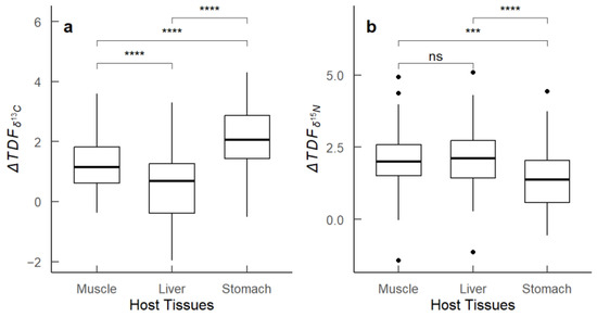 Box plots of ΔTDF values between host tissues of M. hubbsi and their infecting Anisakidae larvae. (a) values showing the difference in δ13C between host tissues (muscle, liver, stomach) and the parasites; (b) values showing the difference in δ15N between host tissues (muscle, liver, stomach) and the parasites. Asterisks indicate significance levels: **** for (p < 0.0001), *** for (p < 0.001), ns for not significant. The dots in subfigure (b) represent outlier data points for the values between the host tissues (muscle, liver, stomach) and the parasites.