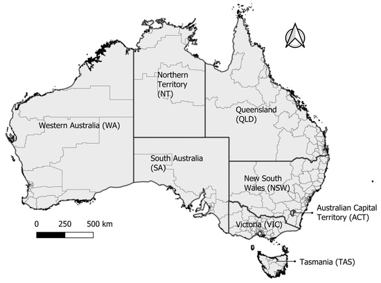 This study included 311 Statistical Area level 3 (SA3s) boundaries, which comprise geographic Australia, according to the 2011 system of SA3 categorization [50] (Figure 1). The Australian Bureau of Statistics (ABS) has defined SA3 region categorization for regional data analysis at the regional level. SA3 regions are sufficiently small to enable detailed analysis of weather and climate data, yet broad enough to ensure inhabitant anonymity. The study included the states of New South Wales, the Northern Territory, South Australia, Tasmania, Queensland, Victoria, and Western Australia. Human research ethics approvals could not be secured for the Australian Capital Territory datasets due to logistic reasons, and thus this set was not included. As the Australian Capital Territory accounted for only a small proportion of arboviral notifications (0.2% of BFV or RRV cases, 1.3% of DENV cases, 0.8% of ZIKV cases, and 0% of MVEV, JEV, WNVKUN, or CHIKV cases), we do not consider that the exclusion is likely to affect the results of the study.