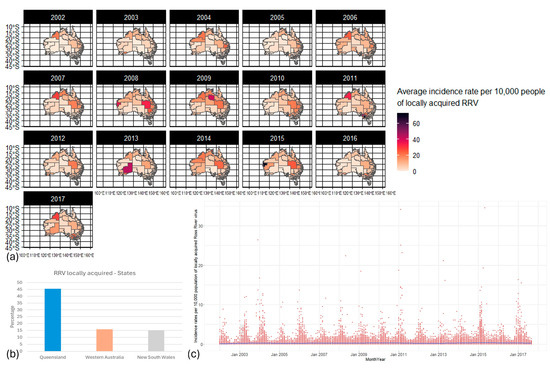 RRV incidence rates were also scattered through space and time (Figure 2a), with most cases acquired in Queensland (45%), Western Australia (16%), and New South Wales (15%; Figure 2b). Peak transmission of RRV occurred almost every year, with the highest also following a two- to three-year cycle (in 2003, 2006, 2008, 2010, 2015, and 2017; Figure 2c).