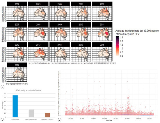 BFV incidence rates were relatively scattered through time and space (Figure 3a), with approximately 55% of BFV cases occurring in Queensland, 19% in New South Wales, and 10% in NT (Figure 3b). Peaks of transmission occurred every two to three years (2003, 2006, 2008, and 2013; Figure 3c).