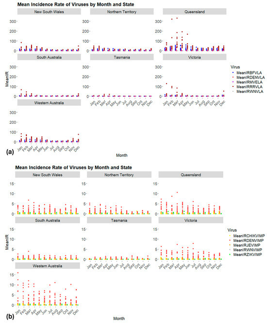 Monthly incidence rates per 10,000 population of eight arboviruses from 2002 to 2017 per state in Australia. (a) Locally acquired and (b) imported. MeanIR: mean incidence rate per 10,000 population. Each arbovirus is symbolized by a color. BFVLA: locally acquired Barmah Forest virus; RRVLA: locally acquired Ross River virus; DENVLA: locally acquired dengue virus; MVELA: locally acquired Murray Valley encephalitis virus; WNVLA: locally acquired West Nile virus Kunjin strain; CHIKVIMP: imported chikungunya virus; DENVIMP: imported dengue virus; JEVIMP: imported Japanese encephalitis virus; WNVIMP: imported West Nile virus; ZIKVIMP: imported Zika virus.
