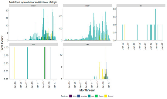 The imported cases of DENV, CHIKV, and JEV were mainly from infections within the continent of Asia, followed by Oceania (Figure 6), with Indonesia being the first source of origin of the above arboviruses (representing 53%, 34%, and 38% of the total count for DENV, CHIKV, and JEV, respectively; Table 2). The total number of DENV imported cases consistently peaked above 100 imported cases from the end of 2010. Additionally, CHIKV began to be regularly imported from 2010 onwards.