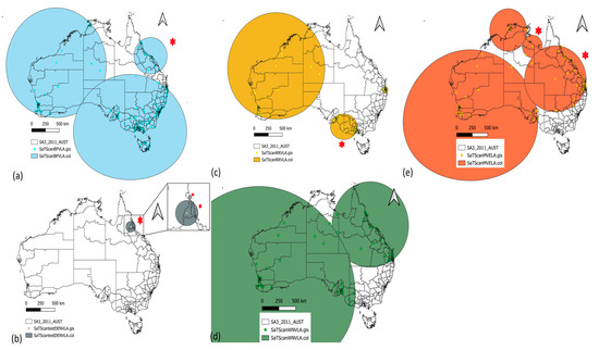 Space–time clusters for locally acquired arboviruses. (a) Barmah Forest virus, (b) dengue virus, (c) Ross River virus, (d) West Nile virus, Kunjin strain, and (e) Murray Valley encephalitis. Red star: most likely cluster.