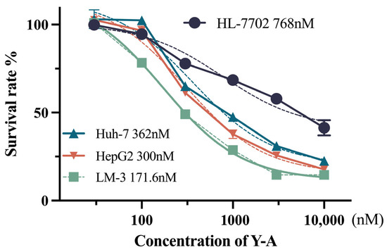 Effect of Y-A on cell viability in HL-7702, HepG2, LM-3, and Huh-7 cells. Cells were incubated with Y-A as indicated for 24 h. The IC50 was measured by GraphPad Prism 9 (GraphPad Software).