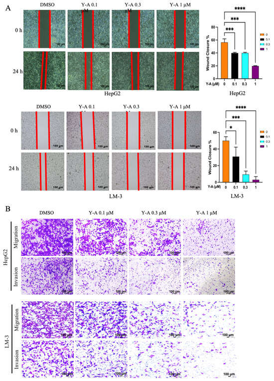 In order to examine the biological role of Y-A in hepatocellular carcinoma (HCC) cells, experiments including wound healing and transwell migration/invasion assays were performed. HepG2 and LM-3 cells were exposed to different concentrations of Y-A (0.1 μM, 0.3 μM, 1 μM). The scratch test results show a concentration-dependent inhibition of the wound-healing ability of HepG2 and LM-3 cells after Y-A treatment (Figure 2A). Furthermore, transwell assays revealed significant reductions in the migration and invasion abilities of HepG2 and LM-3 cells following Y-A treatment (Figure 2B). These results indicate that Y-A effectively inhibits the migration and invasion of HCC cells.