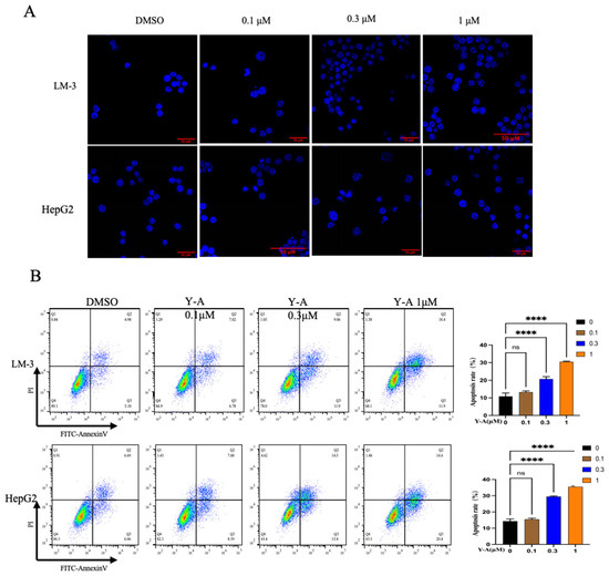 To assess nuclear morphology, HepG2 and LM3 cells (5 × 105 cells/well) were treated with various concentrations of Y-A (0.1 μM, 0.3 μM, and 1 μM) for 24 h. After treatment, the cells were stained with Hoechst 33,342 to visualize the nuclei. The nuclear morphology was then observed and recorded using a fluorescence microscope (Zeiss LSM780, Carl Zeiss AG, Oberkochen, Germany).