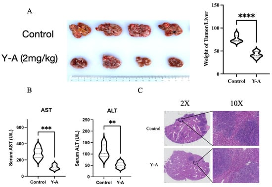 Y-A inhibits the growth of transplanted tumors in mice (n ≥ 5 per group). (A) After two weeks of Y-A treatment (2 mg/kg/day), the mice were euthanized and the liver tissues were extracted, photographed, and weighed as indicated. Y-A treatment group showed significant tumor growth inhibition compared to control. (B) Serum biochemical detection of ALT and AST protein levels after two weeks of Y-A treatment. (C) Representative H&E staining analysis of liver tumor lesions from mice. ** p < 0.01; *** p < 0.001; ****p < 0.0001, by unpaired Student’s t-test.