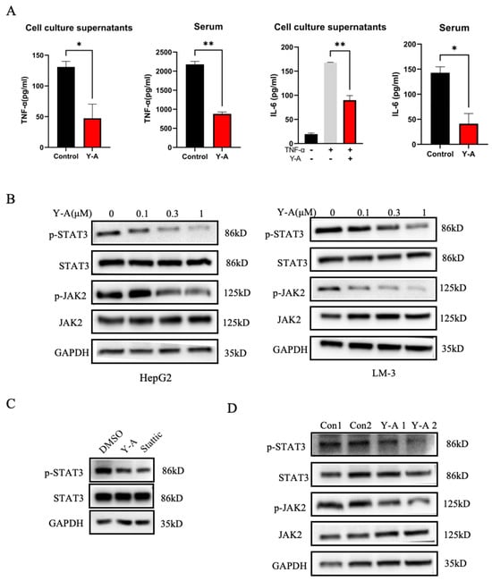 Y-A inhibits growth of liver cancer cells through JAK-STAT pathway. Representative Western blot shown. (A) Elisa detects expression levels of TNF-α and IL6 in cell culture supernatant and mouse serum, respectively. * p < 0.05; ** p < 0.01; by unpaired Student’s t-test. (B) Western blot analysis of STAT3, p-STAT3, JAK, and p-JAK in HepG2 and LM-3 cells. (C) Western blotting to detect effect of Stattic (5 μM), a STAT3 inhibitor, and Y-A on the phosphorylation of STAT3 and JAK in HepG2 cells. (D) Western blotting patterns of p-STAT3, STAT3, p-JAK2, and JAK from Y-A treated in tumor show decreased p-STAT3 and p-JAK2.