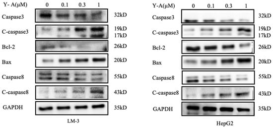 Y-A induces LM-3 and HepG2 cell apoptosis through JAK/STAT signaling. Y-A treatment inhibits STAT3, anti-apoptotic pathways, and disrupts Bcl-2 proteins. Western blotting patterns of Caspas3, Caspas8, Bcl-2, and Bax from Y-A treated in tumor showed that Caspase-3, Caspase-8, and Bcl-2 were decreased.
