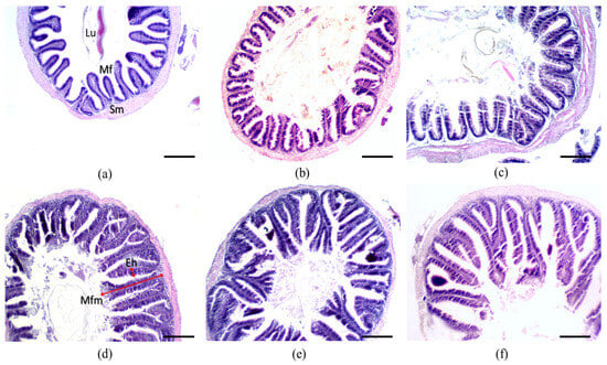 Cross section of the proximal intestine of juvenile hybrid red Tilapia fed diets supplemented with organic silicon. Treatments: (a) 0 (control), (b) 10, (c) 20, (d) 30, (e) 40 and (f) 50 mg·kg−1 of organic silicon in the diet. H&E stain. Abbreviations: Lu—Lumen; Sm—subepithelial mucosa; Mf—mucosal fold; Mfm—mucosal fold length; Eh—enterocyte height. The scale bar is 100 µm.