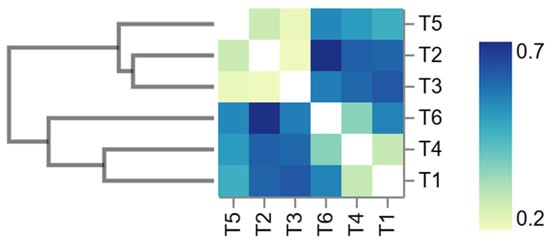 Bray–Curtis cluster tree and diversity distance heat map, showing results of beta diversity analysis at the phylum level of juvenile hybrid red Tilapia fed diets supplemented with organic silicon. Treatments: T1-0, T2-10, T3−20, T4-30, T5-40 and T6-50 mg·kg−1 of organic silicon in the diet.