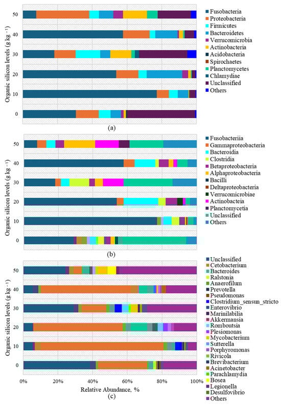 Average relative abundance in dominant bacteria of juvenile hybrid red Tilapia fed diets supplemented with organic silicon. Phylum (a), Class (b) and Genus (c).