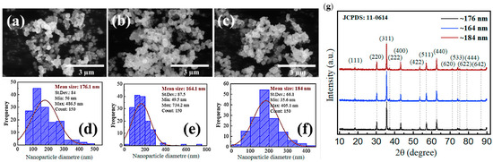 (a–c) The SEM images of Fe3O4. (d–f) Corresponding particle sizes distributions. (g) The XRD of Fe3O4 nanoparticles.