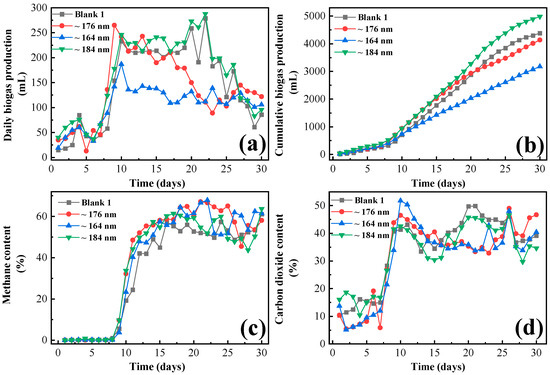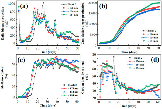 As can be seen in Figure 2, the addition of magnetite of ~184 nm effectively increased the gas production of the frass from swine manure compared to the blank 1 group. From the 8th and 9th days, the gas production of each fermentation group began to increase significantly, and the daily gas production of the ~184 nm group was higher than that of the blank 1 group within 30 days. The addition of Fe3O4 in the form of nanoparticles reduced the lag phase, biostimulated the methanogenic bacteria, and increased their activity [33]. However, the ~176 nm and ~164 nm groups show inhibition on the frass anaerobic fermentation. Especially, the daily gas production of the ~164 nm group was lower than that of the blank group within 30 days (40.1 mL on average). The daily gas production of the ~176 nm group was slightly lower (8.2 mL on average) than the blank. The maximum daily biogas production is 288 L, which occurs on the 22nd day of the ~184 nm group.