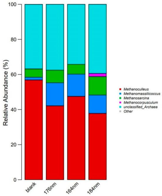 From Table 2, it can be seen that the Shannon values of the ~184 nm group are optimal, indicating the maximum gas production microbial diversity, which may be the reason for the highest gas production in the ~184 nm group. Secondly, the Shannon value of the ~176 nm group is 1.61; the third ~164 nm group is 1.60. Among them, the Shannon value of the blank 1 group is the lowest, which is 1.36, indicating the lowest microbial diversity. The OTUs clustering values of the blank group and the 100 nm group were higher, at 18 and 17, respectively. However, there is no positive correlation with biogas production. It was reported that 200 mg/L Fe3O4 NPs could promote the diversity of bacterial and archaeal communities [50].