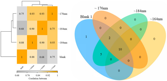 Sample correlation heatmap (the color block represents the correlation index value, and the grayer the color, the more it represents; the lower the correlation index between samples, the yellow the color, and the higher the correlation index); Venn diagram of species distribution represented by different colors, the numbers in the figure represent the number of specific or shared species.