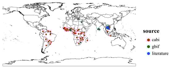 We collected distribution records of P. manihoti from the Center for Agriculture and Bioscience International (CABI) [24], the Global Biodiversity Information Facility (GBIF) [41], and related literature [13,42]. Initially, we removed specimen coordinates or incorrect distribution data, then used the spThin package (version 0.2.0) to retain only one distribution point per 5 min × 5 min raster to avoid a spatial sample bias [43]. Ultimately, we obtained 102 occurrence records of P. manihoti for the model setting (Figure 1). We imported the distribution records into the model using the BIOMOD_FormatingData function in the Biomod2 package (version 4.2-4), controlling the generation of pseudo-absences (PA) using the PA.nb.rep, PA.nb.absences, and PA.strategy parameters. In this study, we generated pseudo-absence points by randomly generating 10 instances and repeating the generation 3 times.