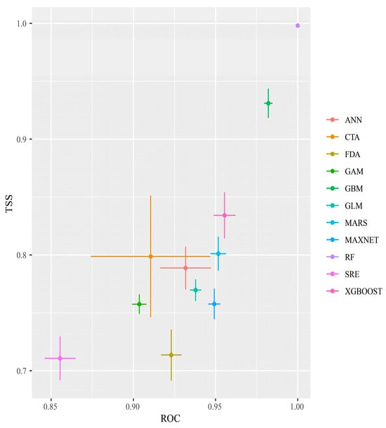 After 10 repeated runs of the single and combined models, and based on the TSS and ROC evaluations, RF had the highest TSS and ROC values, and SRE had the lowest TSS and ROC values, although its TSS was still >0.7 and its AUC was >0.85. All 11 models met the screening criteria (Figure 2) and were, therefore, used to construct the integrated model.