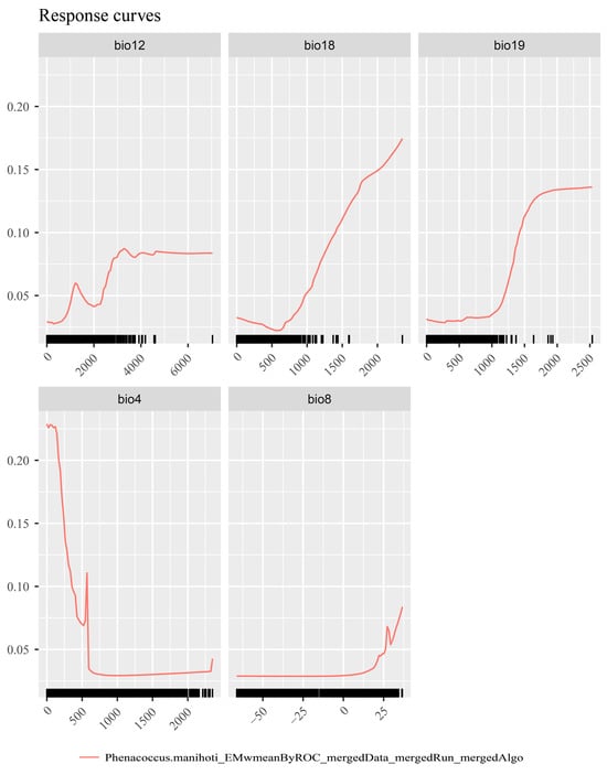 Environmental factor response curves reflect the effect of environmental variables on habitat suitability [69]. According to the response curve of cassava mealybugs (Figure 3), bio4 (temperature seasonality) varied greatly within a small range of values, bio8 (mean temperature of the wettest quarter) varied significantly at 25 °C, bio12 (annual precipitation) varied significantly around 4000 mm, bio18 (precipitation of the warmest quarter) showed high suitability at about 500 mm, and bio19 (precipitation of the coldest quarter) showed significant changes and higher suitability at about 1000 mm. The response curves indicated that cassava mealybugs prefer warm and stable temperature conditions.