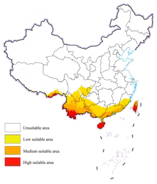 The potential geographical distribution of cassava mealybugs worldwide under historical climatic conditions was predicted by the integrated model using EMwmean (Figure 4). In China, cassava mealybugs were generally found in fewer areas. High-suitable areas mainly existed in parts of southeastern Tibet and southern Yunnan, as well as in Taiwan, most of Hainan province, and scattered areas in Guangdong and Guangxi. The suitable area expanded inland from high-suitable areas and could be found in provinces such as Yunnan, Guizhou, and Fujian.