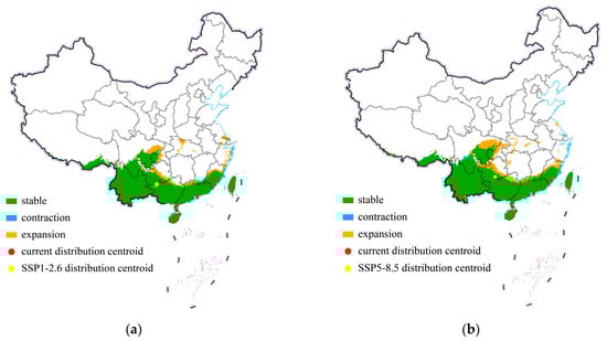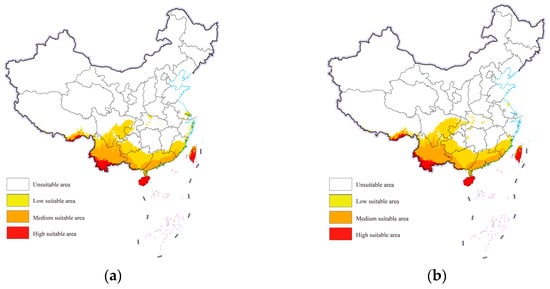 Shifts in potential suitable habitats of Phenacoccus manihoti in China under different climate scenarios: (a) SSP1-2.6; (b) SSP5-8.5.