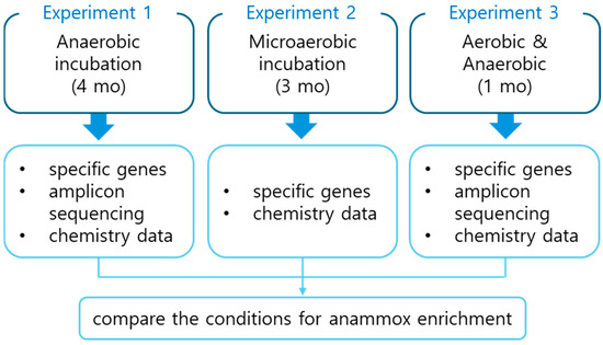 Most cultures of anammox bacteria were enriched from sludges and marine origins using sequencing batch reactors (SBRs) [20]; however, anammox activities and molecular evidence have been repeatedly reported from terrestrial environments including rice paddy soils [21]. To expand the sources of anammox microorganisms for various applications, it is essential to explore enrichment possibilities from less-studied environmental media. In this study, we investigated suitable conditions for anammox enrichment from rice paddy soils. To simplify anammox enrichment using batch incubations without a sequencing batch reactor (SBR), we conducted several batch incubations and compared various conditions for anammox enrichment, focusing on the presence of oxygen, by incubating rice paddy soils in growth media with NO2− and NH4+ under microaerobic and anaerobic conditions. Our goal was to develop effective anammox enrichment methods and compare three different experimental setups to identify the optimal conditions for enrichment using rice paddy sediments. Throughout the experiments, we monitored specific genes and microbial community structures over time to observe enhanced enrichment of anammox microorganisms in the three different incubation types. This study explored strategies to enrich and/or accelerate the activity of anammox bacteria using natural soil samples rather than activated sludges from wastewater treatment bioreactors.