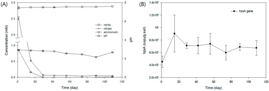 Anaerobic batch incubation. (A) Concentrations of nitrite, nitrate, and ammonium. (B) Absolute copy numbers of hzsA gene during the incubation period.