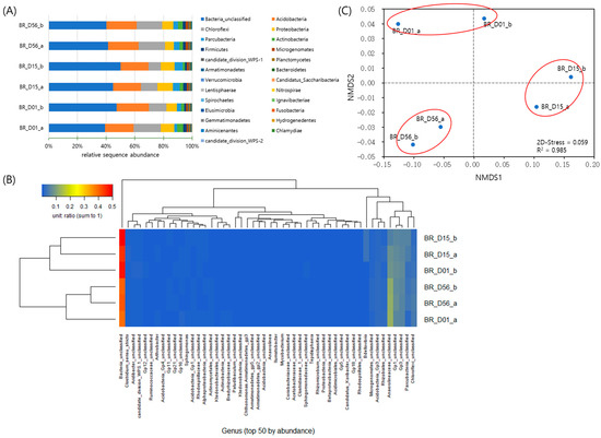 The most abundant 50 genera among the total 337 were used for the sequence abundance-based heatmap with dendrograms using the Bray–Curtis dissimilarity (Figure 3B). A few genera including unclassified Anaerolineaceae, unclassified Gp1, unclassified Gp3, unclassified Parcubacteria, unclassified Chloroflexi, unclassified Acidobacteria Gp3, and unclassified Rhizobiales accounted for a large proportion of the bacterial communities across the samples (Figure 3B and Figure S3). As in the phylum level heatmap, the communities of day 15 and day 56 were grouped separately in the genus level heatmap (Figure 3B). In particular, the genus Tepidisphaera belonging to the phylum Planctomycetes was ranked 28th among 337 genera (Figure S3). Since little is known about this genus and its function with only one species [31], a potential linkage with the anammox reaction can be considered.