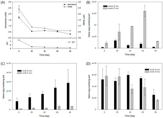 To mimic aqueous sedimentary environments such as streams and riverbeds, the previously anammox-enriched paddy soils were submerged in the column-type of freshwater media with natural oxygen gradient over the depth (Figure S1C). The pH, nitrite (NO2−), and ammonium (NH4+) were monitored over time (Figure 4A). A decrease in pH was observed as the culture progressed, which was presumed to be due to the production of NO2− and NO3− via nitrification and/or oxidation of NH4+ provided in the culture medium at the initial concentration of 0.5 mM. Nitrite concentration decreased along with ammonia, which may be the result of denitrification and/or anammox reaction (Figure 4A). Specific genes mediating the reactions of nitrification and anammox were detected over time and along with the depths (Figure 4B–D). Nitrification is characterized mostly by two-step reactions using amoA gene encoding ammonia monooxygenase subunit A, which oxidizes ammonia to nitrite, and nxrB gene encoding the beta subunit of nitrite oxidoreductase, which oxidizes nitrite to nitrate. Absolute gene copy number of amoA in the unit soil increased at a depth of 3 cm only in the early period (20 days), whereas it increased gradually toward the latter part of the reaction (60 days) at a depth of 7 cm (Figure 4B). This might suggest that ammonia oxidation to nitrite increased in the sediment more actively in the deeper sediment at 7 cm, which was consistent with the decrease in ammonia in the media (Figure 4A). Similarly, the nxrB gene also showed a gradual increase in the sediment, but more actively in the upper parts at 3 cm, indicating oxidation of nitrite to nitrate, concomitantly with oxidation of ammonia (Figure 4C). On the contrary, at the depth of 7 cm, there was not much increase in nxrB, which may suggest nitrite utilization not by aerobic nitrification, but potentially by anaerobic reaction of anammox. The hzsA gene, which is a subunit of the hydrazine synthase, representing a unique phylogenetic marker for anammox bacteria, was found to exist across the depths, despite relatively low absolute amounts in both the depths compared to amoA and nxrB genes (Figure 4D).