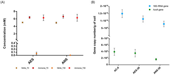 To compare the development of anammox bacteria in the rice paddy soils between aerobic and anaerobic conditions, the same soils were incubated in the anammox media under aerobic and anaerobic conditions. It was found that the initial amounts of nitrite were mostly consumed by 30 days in both the aerobic (AES) and anaerobic (ANS) incubations (Figure 5A), whereas ammonium decreases were minor compared to the nitrite decreases in both the conditions. This may suggest that denitrification was dominant rather than nitrification and/or anammox in both the AES and ANS incubations.
